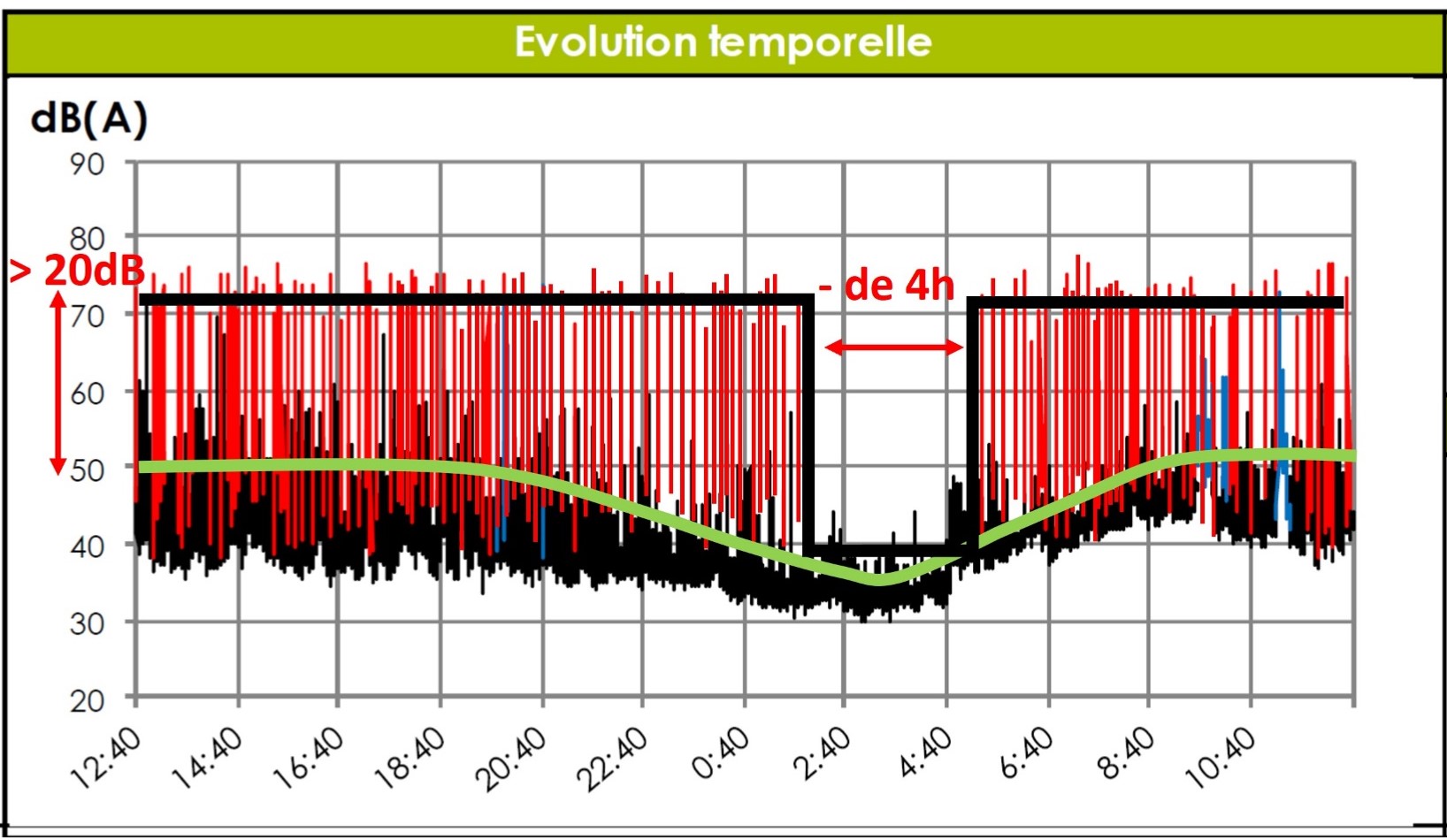 La ligne verte indique le niveau bruit moyen sans passage du T13, soit de moins de 40 dB la nuit (le silence) à 50dB le jour, un milieu calme. Le T13 génère et générera jusqu’à 140 pics de bruit par jour.. et nuit ne laissant que 4h de repos aux riverains. Et à partir de la Phase 2 du projet T13 ce sera 280 passages quotidiens. SANS AUCUNE PROTECTION CONTRE LE BRUIT. MOBILISEZ-VOUS. ADHEREZ A RIVERAIL!