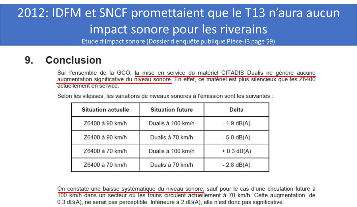 Le T13 mis en service est un train qui passe à 100km/h en ville et génère 140 passages à plus de 70dB jusqu’à plus de 80dB pour les riverains, de 5h20 à 1h20 le lendemain laissant 4 heures de sommeil sans train!