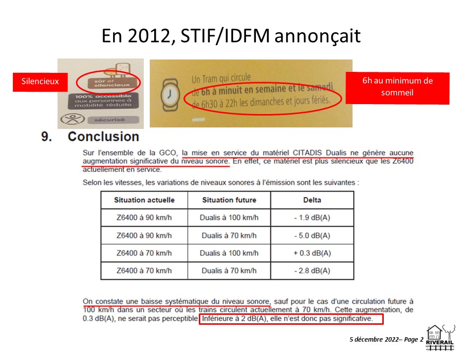 - Régis Duval souligne que la norme n’est pas tout et rappelle la circulaire LOM. Il demande de prendre en compte notre ressenti d’un point de vue Humain. Il est confirmé par M. Sineau (BruitParif) que sur nos communes le bruit augmente de plus de 30 dB(A) à chaque pic et qu’une augmentation de 30 dB(A) multiplie par plus de 1000 fois la puissance sonore et par 10 à 15 fois (voire plus) le ressenti. IDFM est également sollicité sur ce point, mais IDFM ne répond rien !