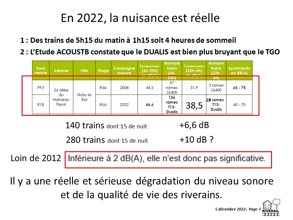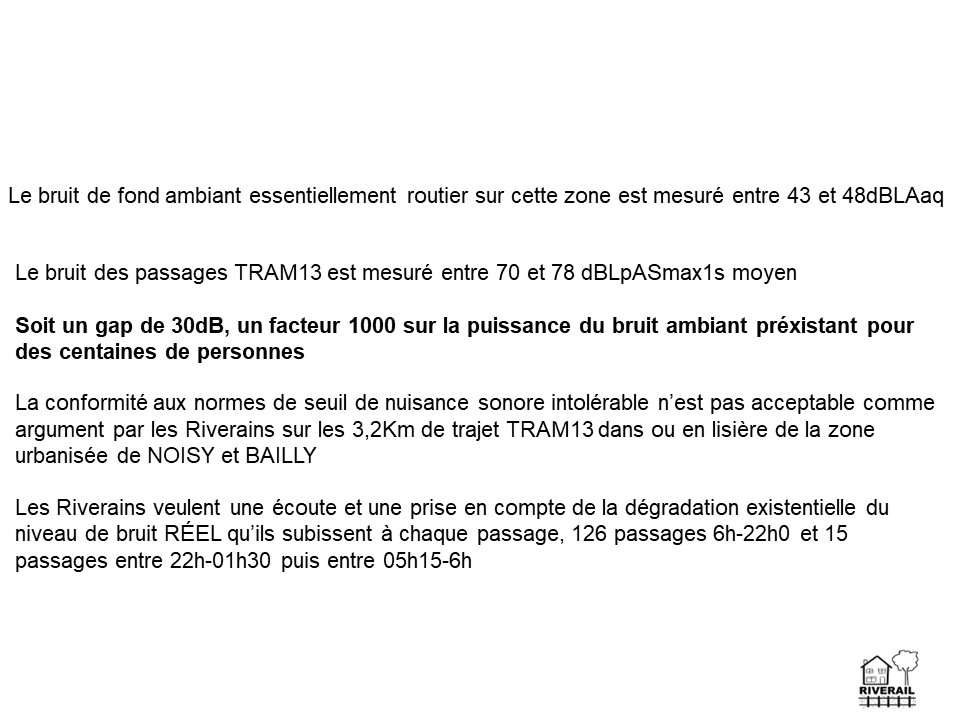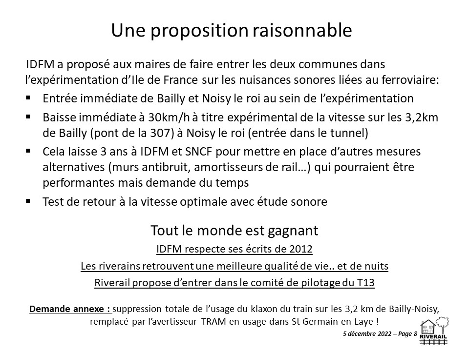 - Stéphane Gaultier conclut avec des propositions constructives : Riverail souhaite rejoindre la copil T13 et ajouter nos 2 communes à la réflexion en cours sur l’évolution de la réglementation, Riverail demande de baisser la vitesse à 30 km/h sur nos 2 communes en attendant les résultats des études en cours sur les évolutions réglementaires ce qui laisse 3 ans à IDFM et SNCF pour mettre en place des mesures alternatives jugées efficaces.