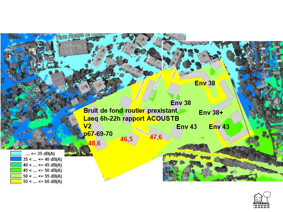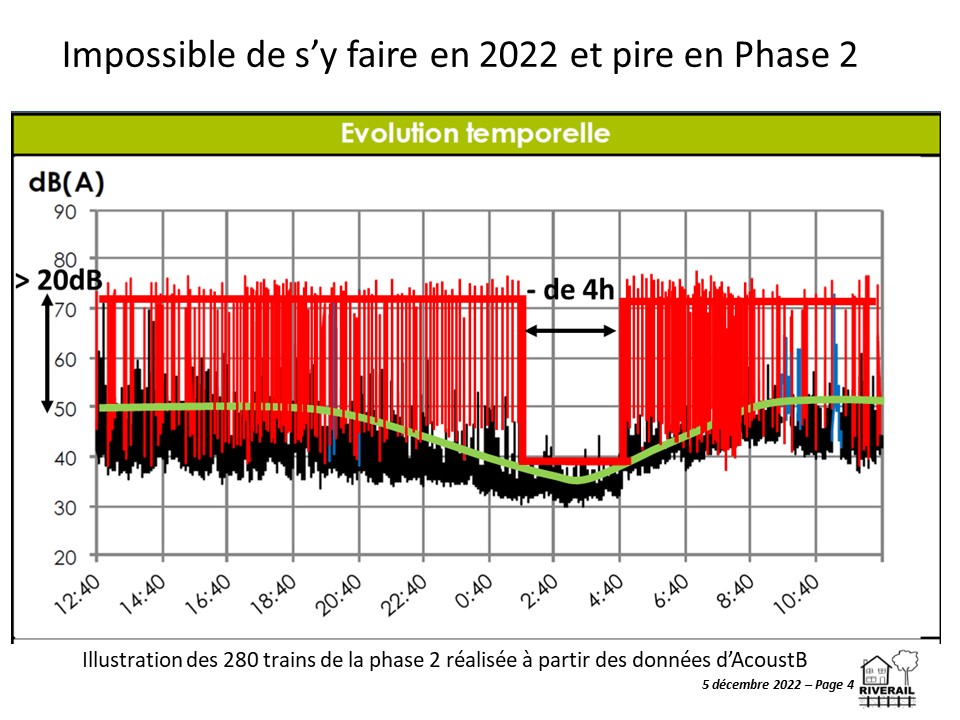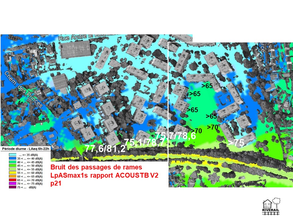 - Riverail note que le slide 6 ne prend pas en compte les bonnes valeurs de pics du rapport AcousTB. L’écart est énorme (4 dB(A) mais Riverail décide de ne pas réagir car cela ne changera rien au débat.