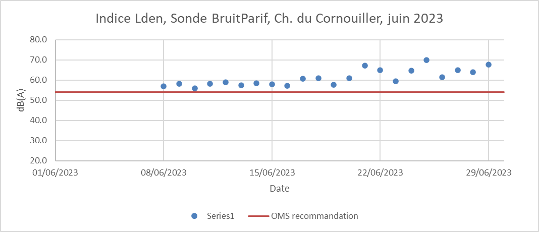 La sonde installée à proximité des habitations du Cornouiller par BRUITPARIF a permis entre le 7 et le 30 juin d’obtenir des relevés précis et officiels de l’impact sonore du T13 sur les riverains. Si on compare l’impact sur la journée de 24 heures en comparant au seuil de 54 dB qui ne devrait pas être dépassé, on constate que le T13 est au dessus avec une pointe à 70 dB en moyenne quotidienne. Soit 16dB de plus alors qu’IDFM promettait un T13 moins bruyant que l’ancien train!!!